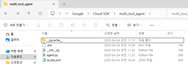 While installing, create a multi_tool_agent folder in the working directory in the file explorer, and then create __init__.py, agent.py, and .env files. For stable authentication, I created a service account and added Editor permissions for the project in IAM. After that, I created and added the sa_key.json file. Please refer to the documents below for detailed instructions.
