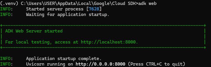 Now you are ready to use ADK. Run the adk web command in the working directory (the parent folder of multi_tool_agent).