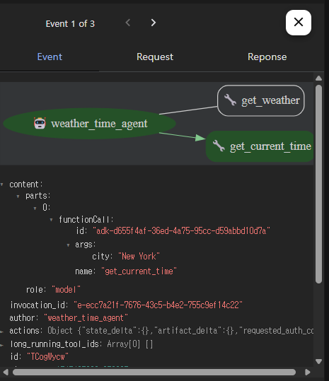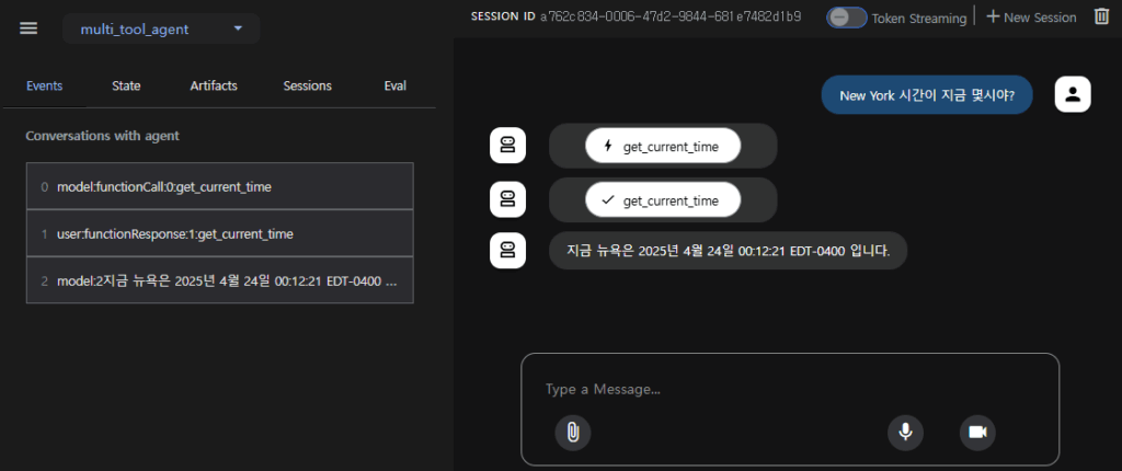 Now, if you access http://localhost:8000 in your browser, you can communicate with the Gemini model in the web UI. The following is an example screen of selecting multi_tool_agent in the upper left corner and calling the time Agent.
